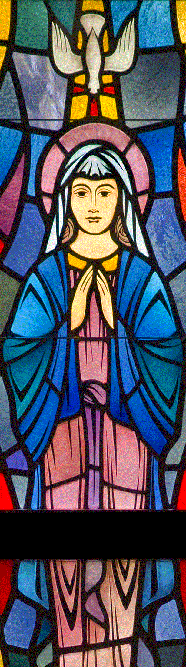 Mary was from the first instant of her conception, without original sin. God created the soul of Mary in sheer holiness. Pope Pius IX declared the Immaculate Conception of Mary as a dogmas of the Catholic Faith on December 3, 1854. Symbolism: Dove – Holy Spirit, through whose power the miracle of the Immaculate Conception; Crescent Moon – Virgin.