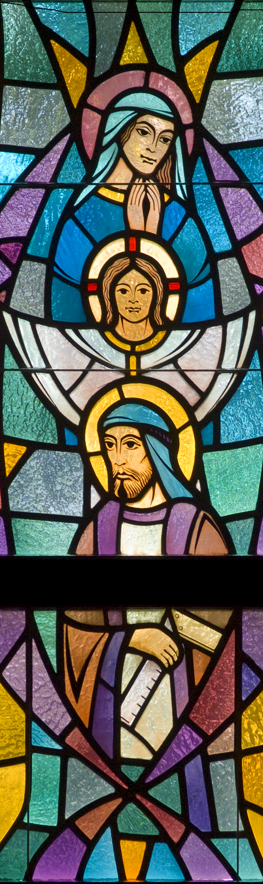 This window depicts portraits of Mary, Jesus and Joseph. The feast celebrating the dignity of the Holy Family is observed on the Sunday within the Octave of the Christmas. The carpenter's square is indicative of Joseph's trade. The three rayed nimbus shows Jesus' divinity.