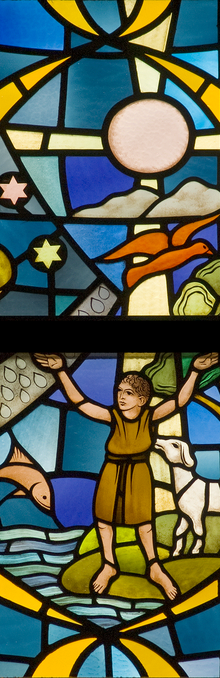 The Creation is symbolically represented by the forms of life depicted in the water, on the land, in the airs, and in the sky. The sun radiates, forming a Cross, signifying God’s Presence over all creation. The upraised Arms of Man acknowledge the beauty of the earth and the magnificence of the Creator.